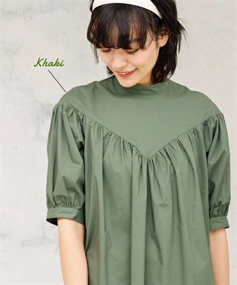 ワンピース ひざ丈 大きいサイズ レディース 綿100% ギャザー デザイン チュニック カーキ 無地 /スモーキーピンク ドット柄 L/LL/3L/4L/5L ニッセン nissen