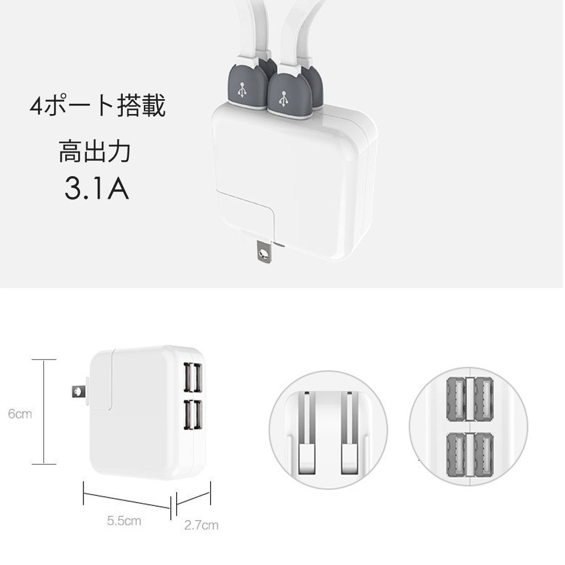 4ポートUSB コンセント 急速充電器商品詳細 商品番号 LSF-033 カラー ホワイト 対応機種 スマートフォン、モバイルバッテリー、タブレットなど サイズ 6×5.5×2.7cm 詳細 ※スマホ充電に1Aの充電量がいります。