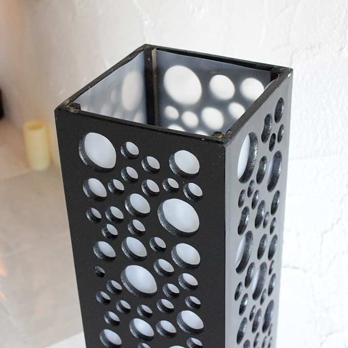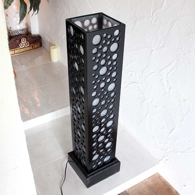 サイズ : 約H100cm×W25cm×D25cm 素材 : MDF(木材)・アクリル カラー : ブラック 生産国 : インドネシア バリ島 付属する照明器具 口金サイズ:E17 / ワット数:40W / 電球クリア / 中間スイッチ(コンセント差込み式) ※LED電球に対応しています。