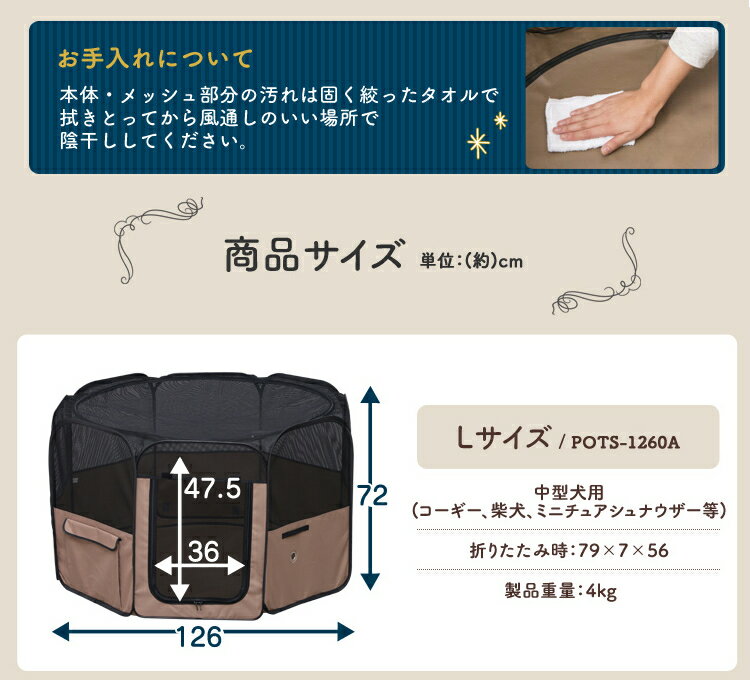 ●商品サイズ(cm)使用時:直径約126×高さ約72折りたたみ時:幅約79×奥行約7×高さ約56入口:約36×約47.5●商品重量約4kg●適合種(目安)コーギー、柴犬、ミニチュアシュナウザー等●適応給水ボトルノズル外径23mmまで